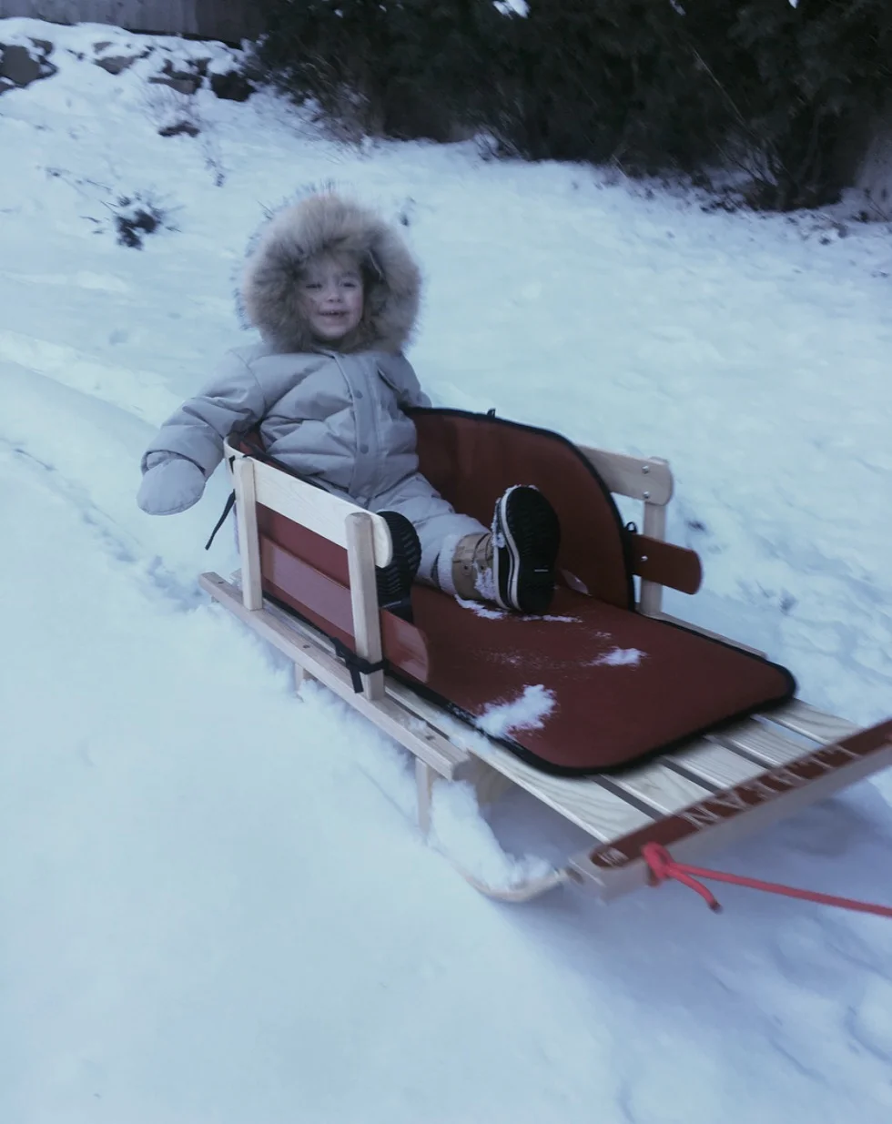 If you looked outside, you'd never know it. But we got one heck of a snowfall last weekend. And it was the perfect opportunity to bundle our little girl up and take her for a sled-ride in one of her very favorite Christmas presents. Because she's just a little thing and it was cold {like really cold} we didn't venture too far; my other half just leading her around the front and backyard. But boy did she love it. And thanks to this super cozy {and pretty chic} snow suit from Bonpoint, MM was warm as can be.