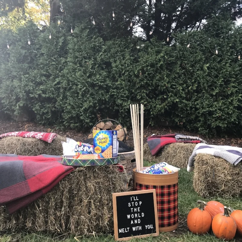 Outside we set up hay bales around the fire pit and covered them with assorted blankets to cozy up with later in the night. A vintage plaid cooler served as the perfect way to store all the necessities for s'mores. And to spice things up a bit we made different variations of the campfire favorite- Reese's Peanut Butter Cup S'mores were made by roasting marshmallows and serving between classic graham crackers; Chocolate Chip Cookies S'mores consisted of traditional Hershey Bars and roasted marshmallows between our favorite soft baked Chocolate Chip Cookies.