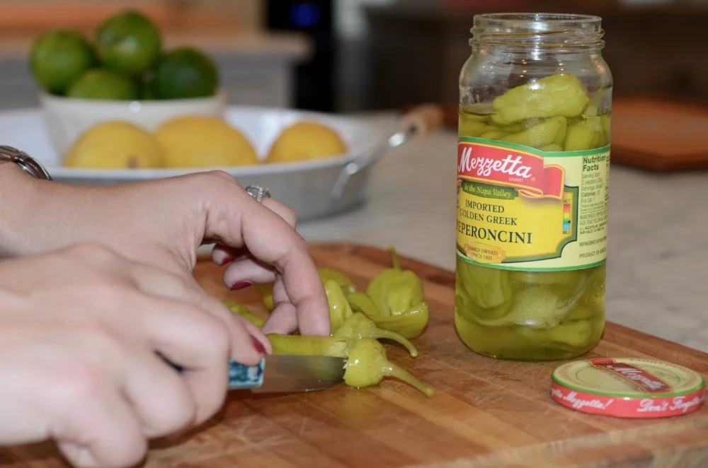 1. Slice tops off of peperoncinis and remove seeds, set aside.