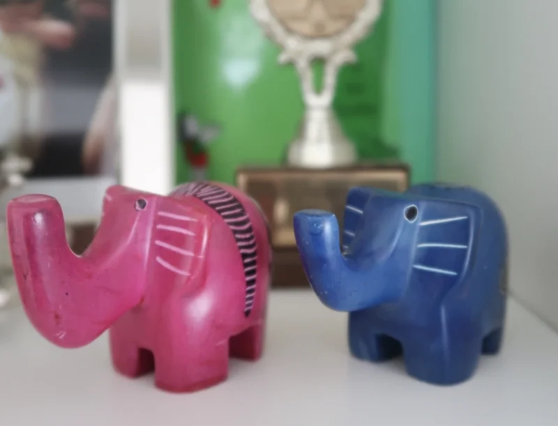 {Trinkets that live in MM's bookcase: elephant figurines from family travels and a heart-shaped rock from her auntie/godmother}