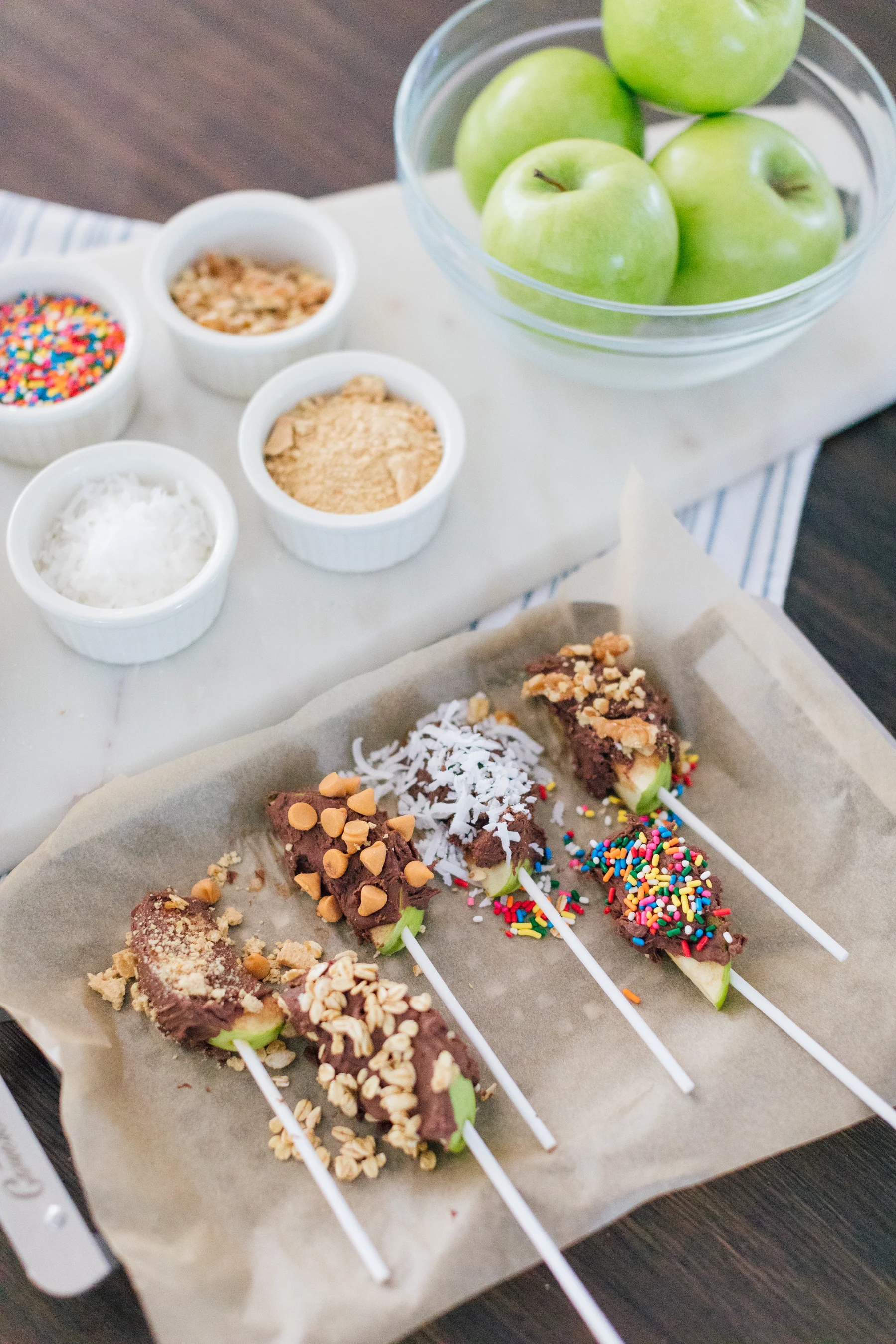 They’re a super easy, kid-friendly treat that can be made as healthy or decadent as you’d like. We chose to dip ours in milk chocolate, but you could easily substitute for peanut butter, caramel or another kind of chocolate. As for toppings, we chose a few of our favorites: sprinkles, coconut, graham cracker, granola, nuts and butterscotch chips. Yum!