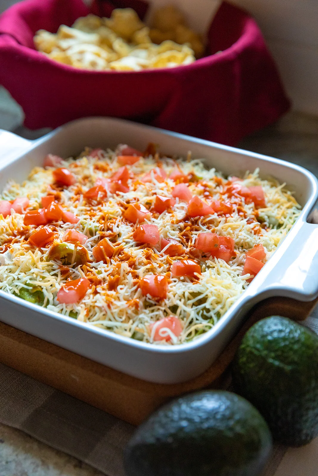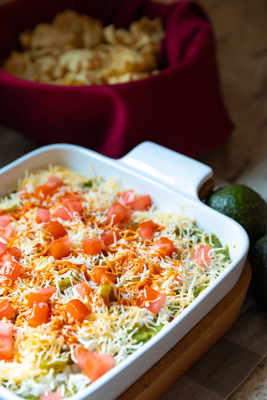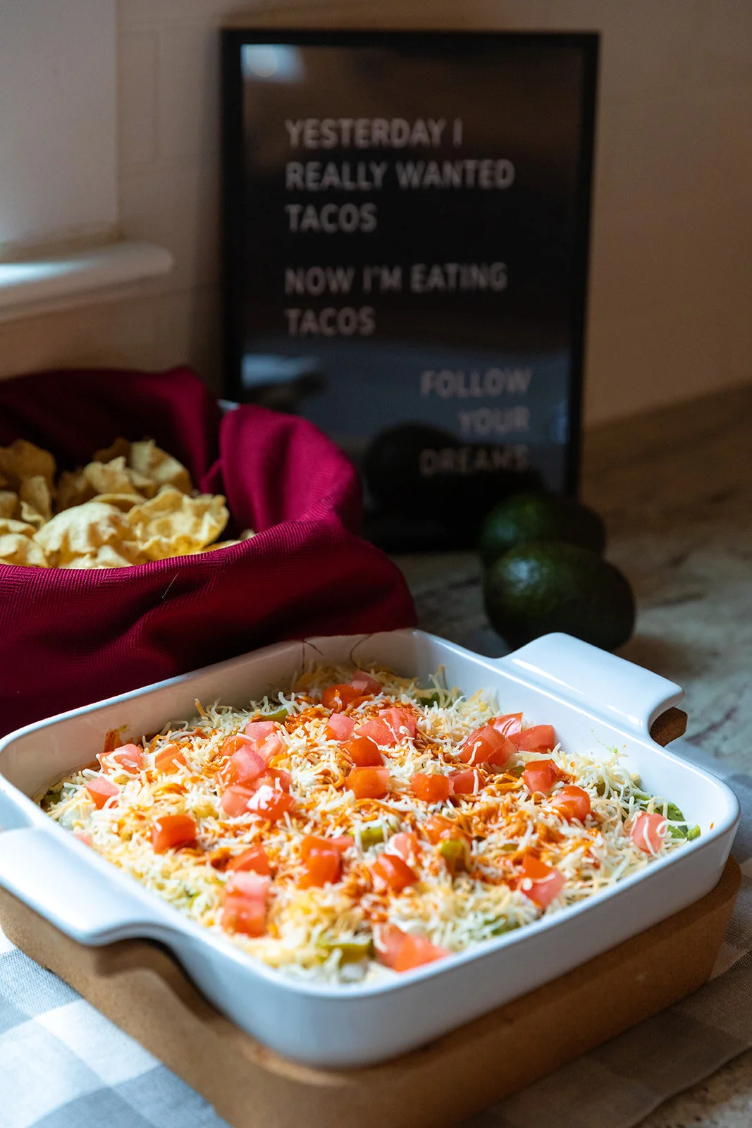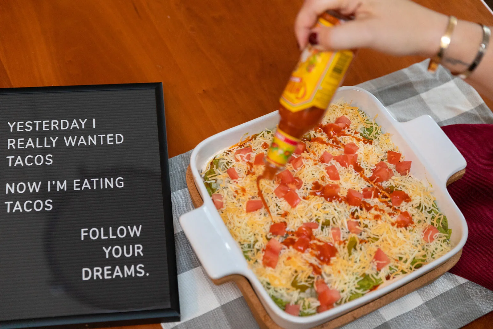 But last week Auntie P blew our minds with her take on the seven layer dip. She swapped the olives {gag} for jalapeños and double doses of Cholula, and concocted a 9-layer take on a classic dish that I now lovingly refer to as, “Auntie P’s Epic Taco Dip.”