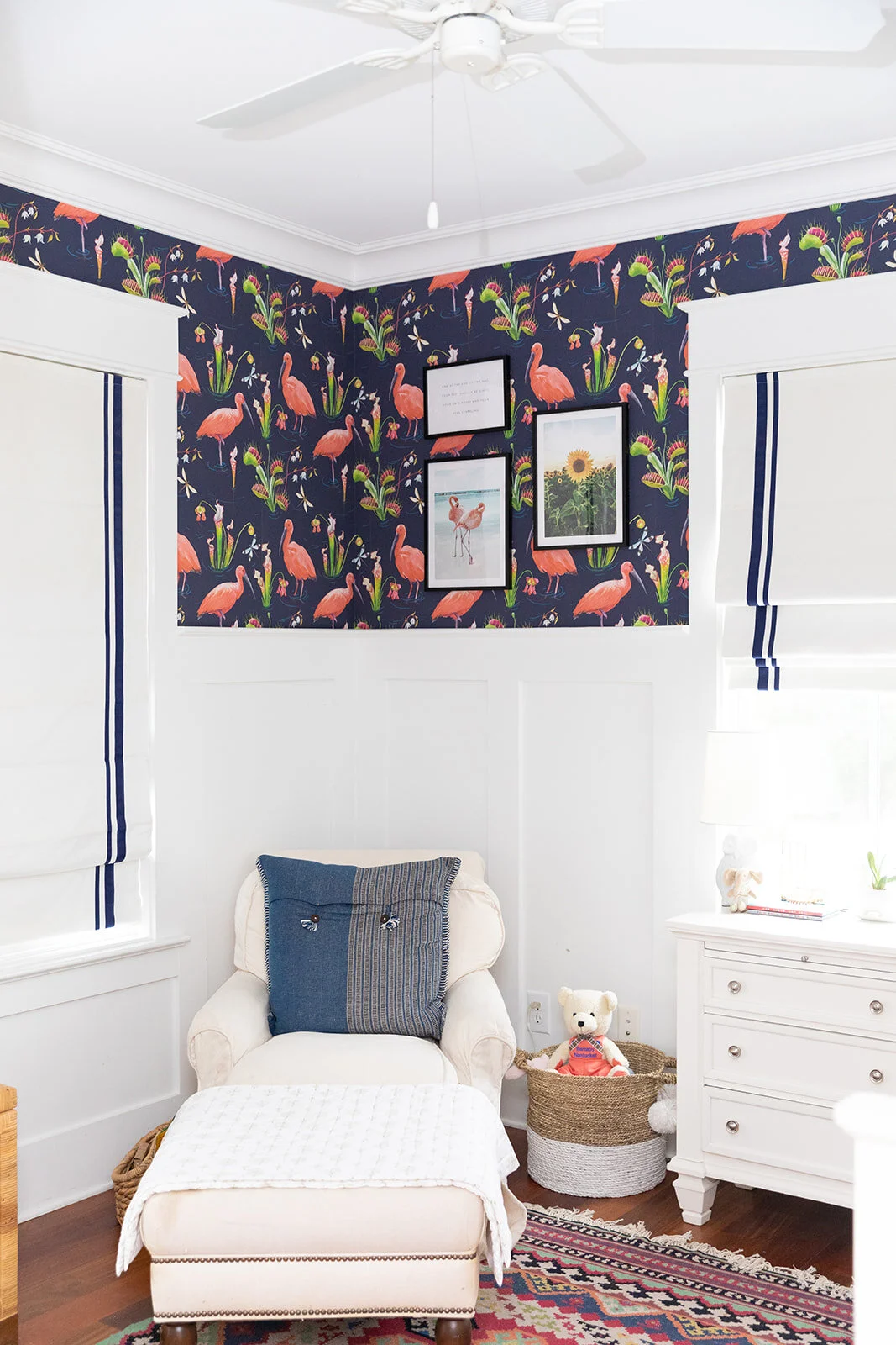 It’s been my very favorite from the start; but it doesn’t mesh well with the artwork we had in our Connecticut nursery, where the walls were stark white, and the vibe was much more nautical and neutral.