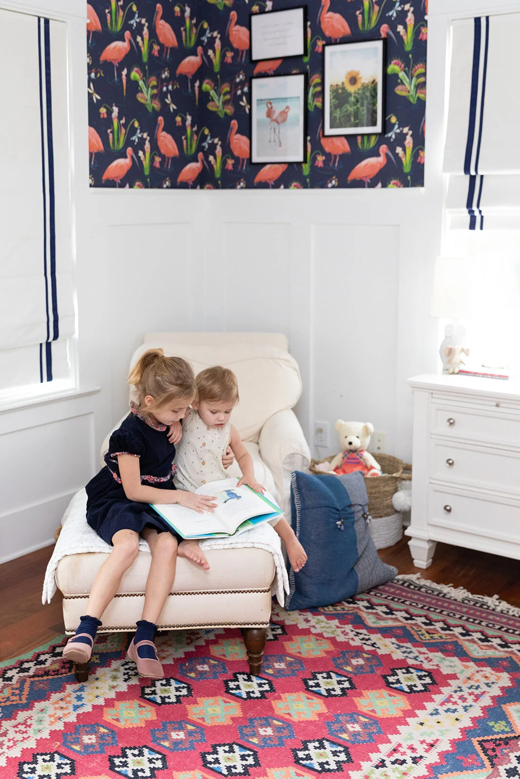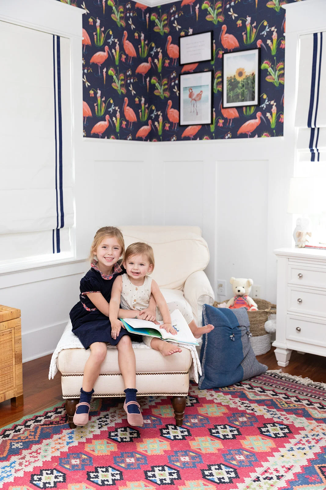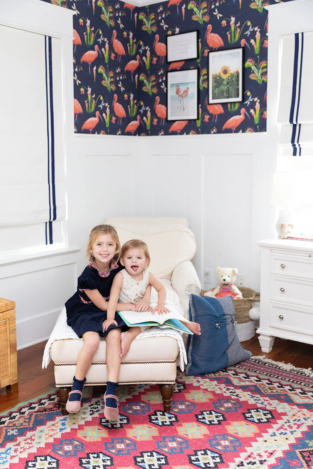 As I’ve mentioned before, the previous owners had two boys, so the first thing we did to make these rooms “ours” was to wallpaper the girls’ walls. This navy and pink Ibis beauty was love at first sight- it fit in quite nicely with the existing curtains and I loved how the colors blended with her rug and accents from our prior nursery.